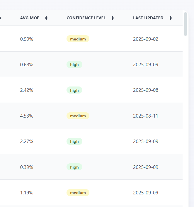 To ensure transparency, our forecasts include margin-of-error ranges based on historical backtesting. Users can see high, low, and central estimates at any given time.&#x20;