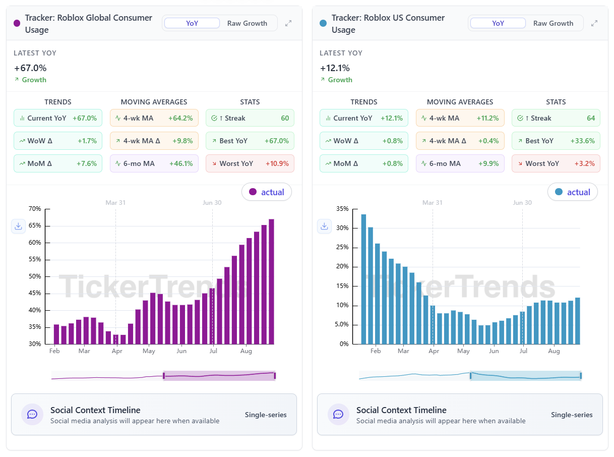 In addition to explicit KPI forecasts, we also provide aggregate Consumer Interest Trackers. These combine multiple alternative data inputs (Google Search, Mobile App Usage, Website Traffic, TikTok Hashtag Views, Reddit activity, Wikipedia page views, Amazon Search, etc.) into a **single demand-side index**. Consumer Interest Trackers default to weekly year-over-year comparisons, making it easy to spot shifts in momentum from week to week. When relevant, we also display the correlation between these consumer trackers and a company’s reported KPIs, providing added context on their predictive power, along with performance metrics such as Pearson r correlations between alternative data signals and reported KPIs. Additionally, many metrics we track are unreported but helpful in terms of what narrative might be driving a stock at a particular time. Examples include our Waymo tracker on $GOOG or Base44 for $WIX. Many other alternative data provides like Yipit or M Science often fully miss to incorporate these signals that TickerTrends captures.&#x20;