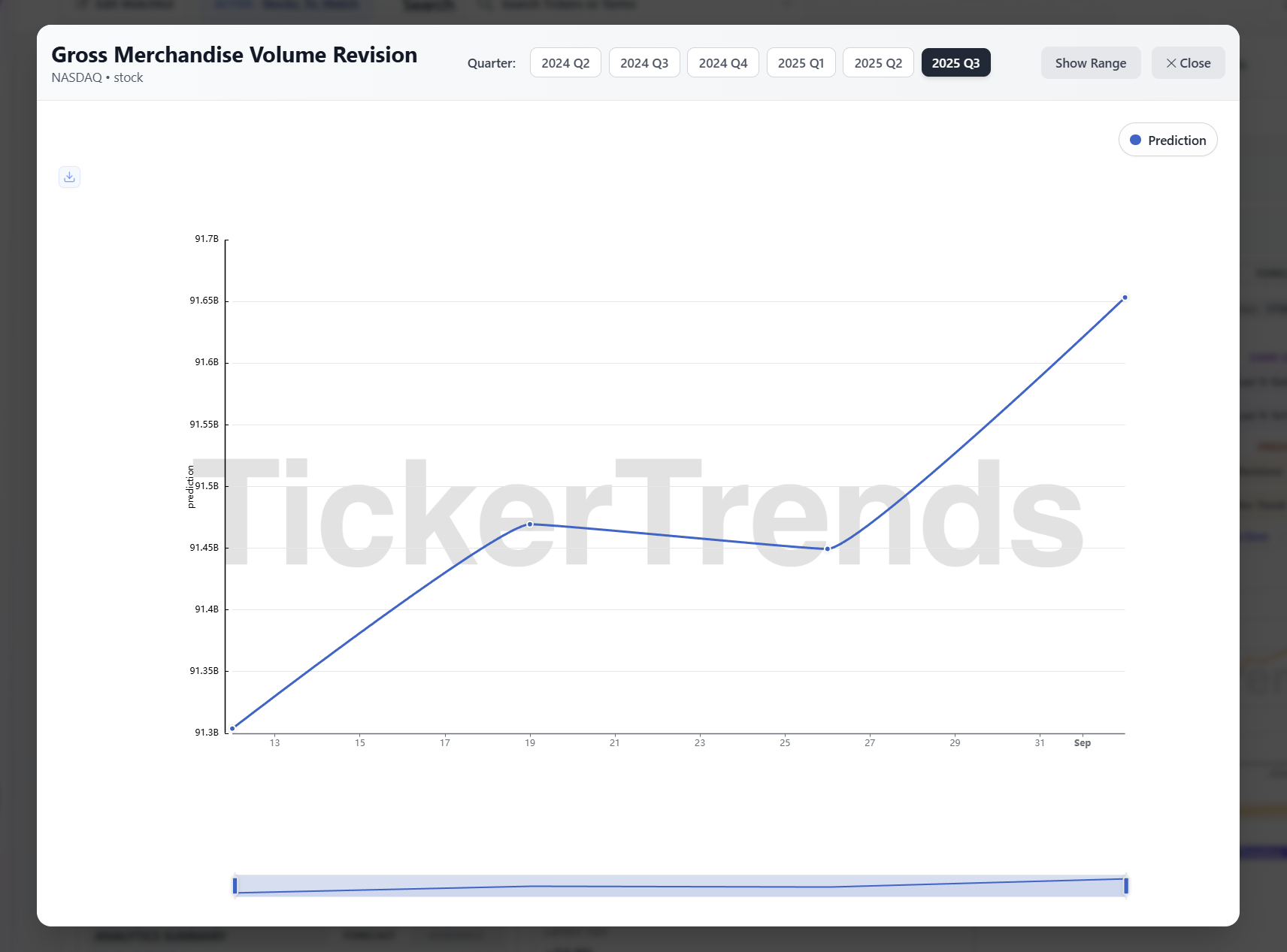 TickerTrends provides forward-looking forecasts for company KPIs such as revenue, EPS-related metrics, daily active users, bookings, and other KPIs that move tickers. These forecasts are designed to give investors and analysts an early view into company performance by combining alternative data signals with market context variables.